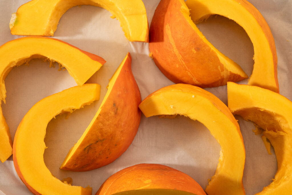 Umytą dynię przekrój na pół, wydrąż miąższ łyżką, a następnie pokrój na ćwiartki lub grube plastry (3-4 cm grubości).