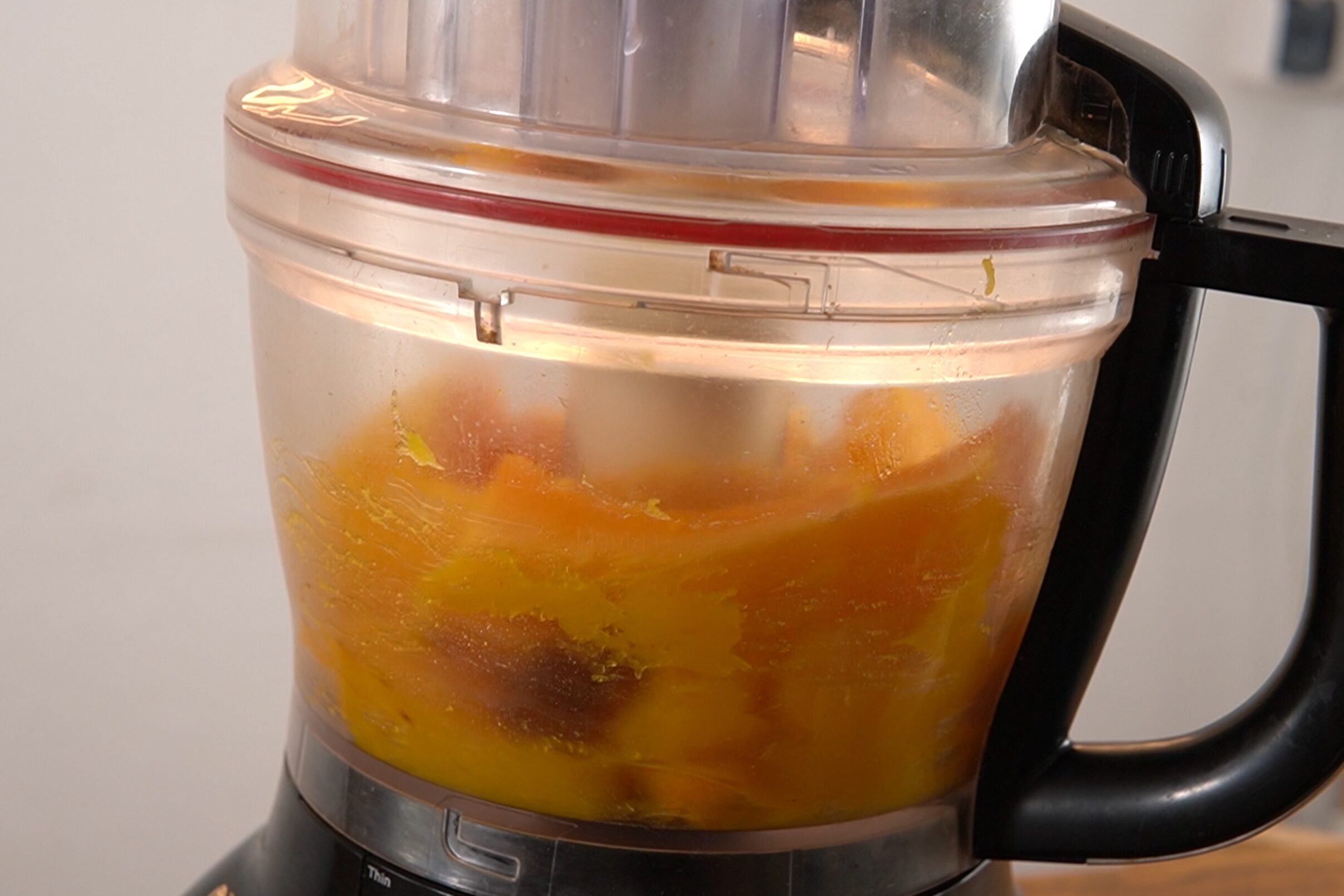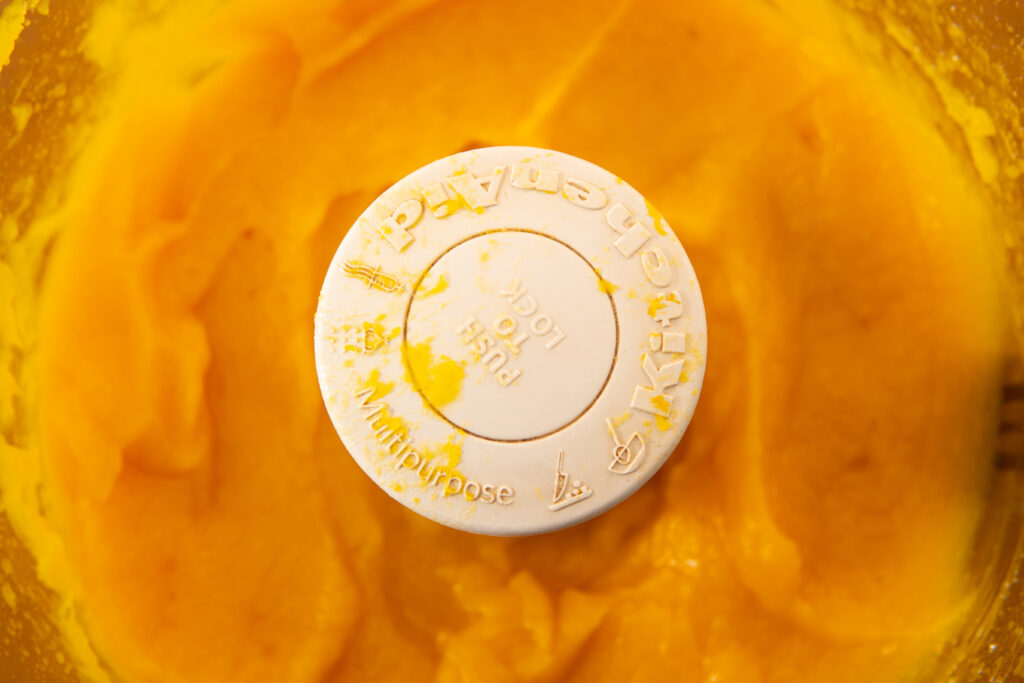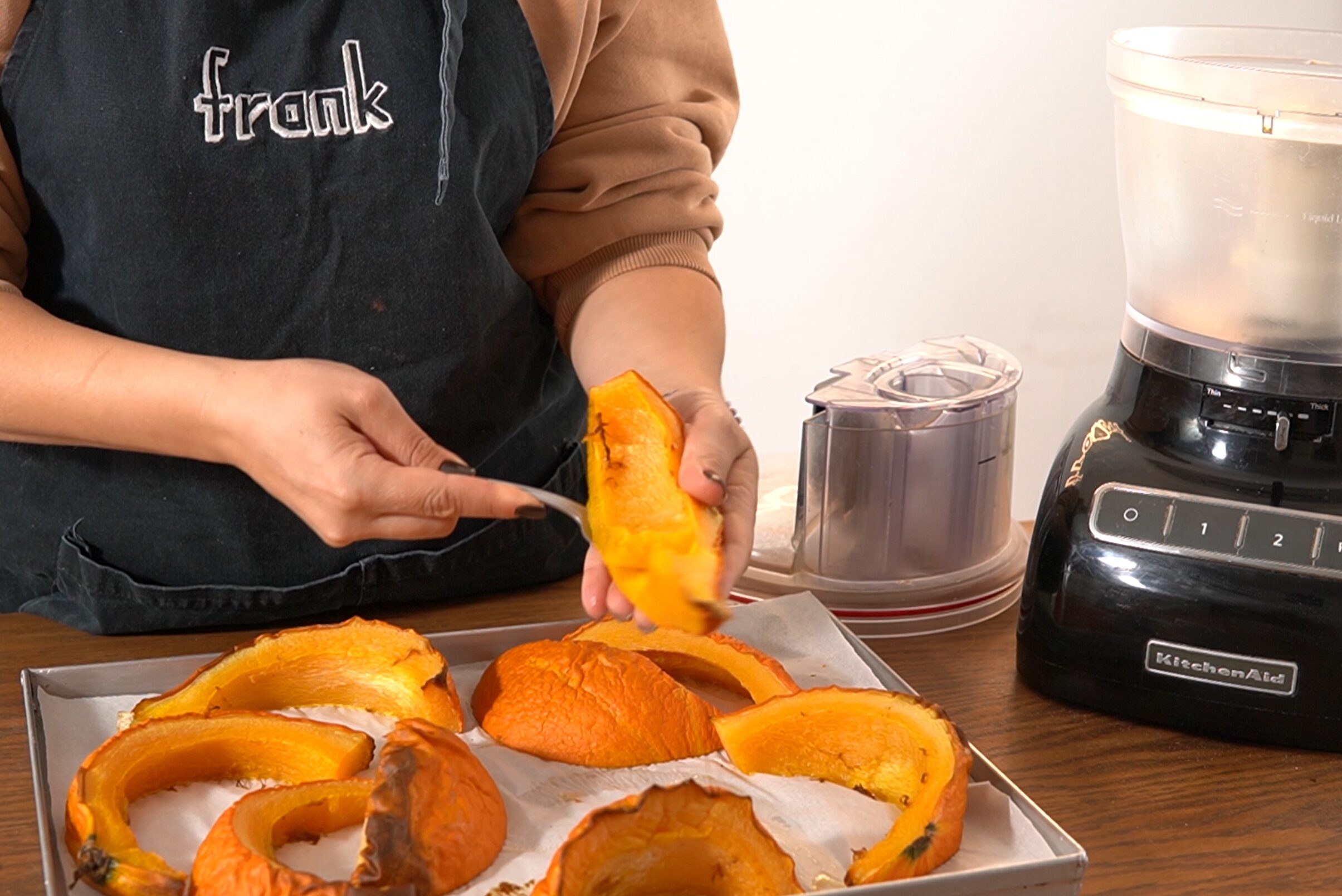 Upieczoną dynię oddziel łyżką od skórki i umieść z misce lub malakserze. Zblenduj do uzyskania bardzo gładkiej konsystencji. Jeśli nie masz malaksera użyj blendera ręcznego.