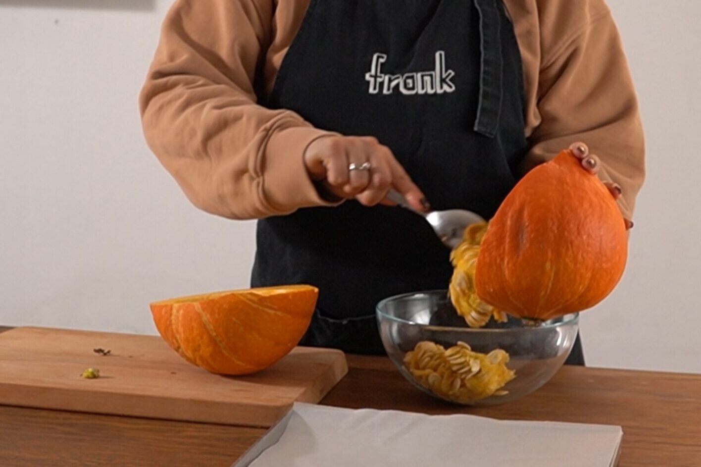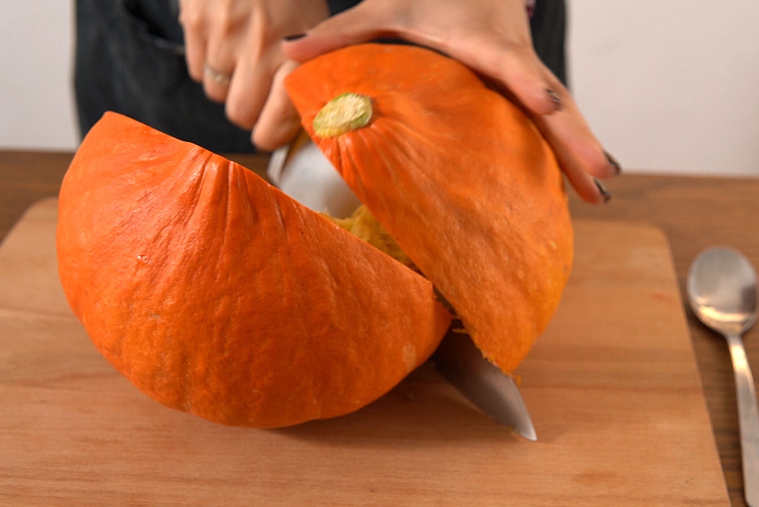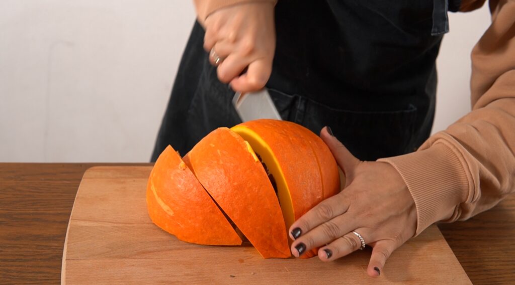 - Umytą dynię przekrój na pół, wydrąż miąższ łyżką, a następnie pokrój na ćwiartki lub grube plastry (3-4 cm grubości).